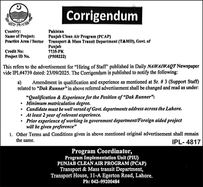 - Hiring of Individual Staff in Punjab Clean Air Program (PCAP) Last Date October 10, 2025
