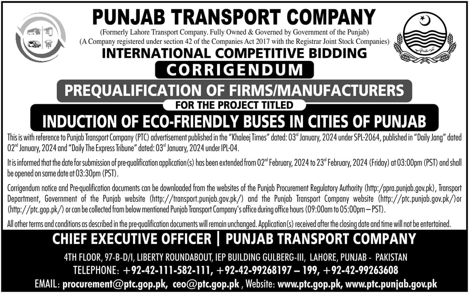 | لاہور، راولپنڈی اور ملتان میں ECO FREINDLY (EV) بسوں کی شمولیت کے لیے اصل سازوسامان کے مینوفیکچرر (OEM's) کی پری کوالیفیکیشن کے لیے بین الاقوامی ٹینڈر |