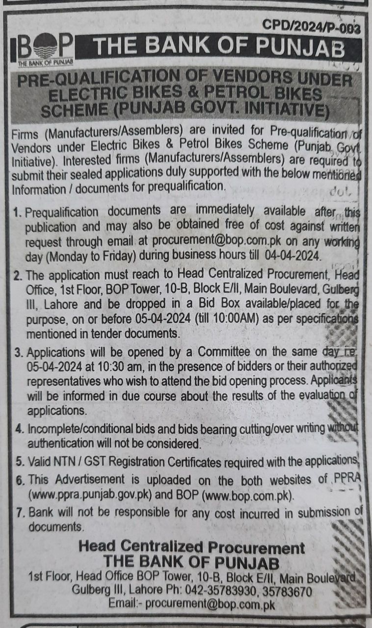 | الیکٹرک اور پیٹرول بائیکس اسکیم کے تحت دکانداروں کی پری کوالیفیکیشن کے لیے ٹینڈر نوٹس (پنجاب حکومت، اقدام) |