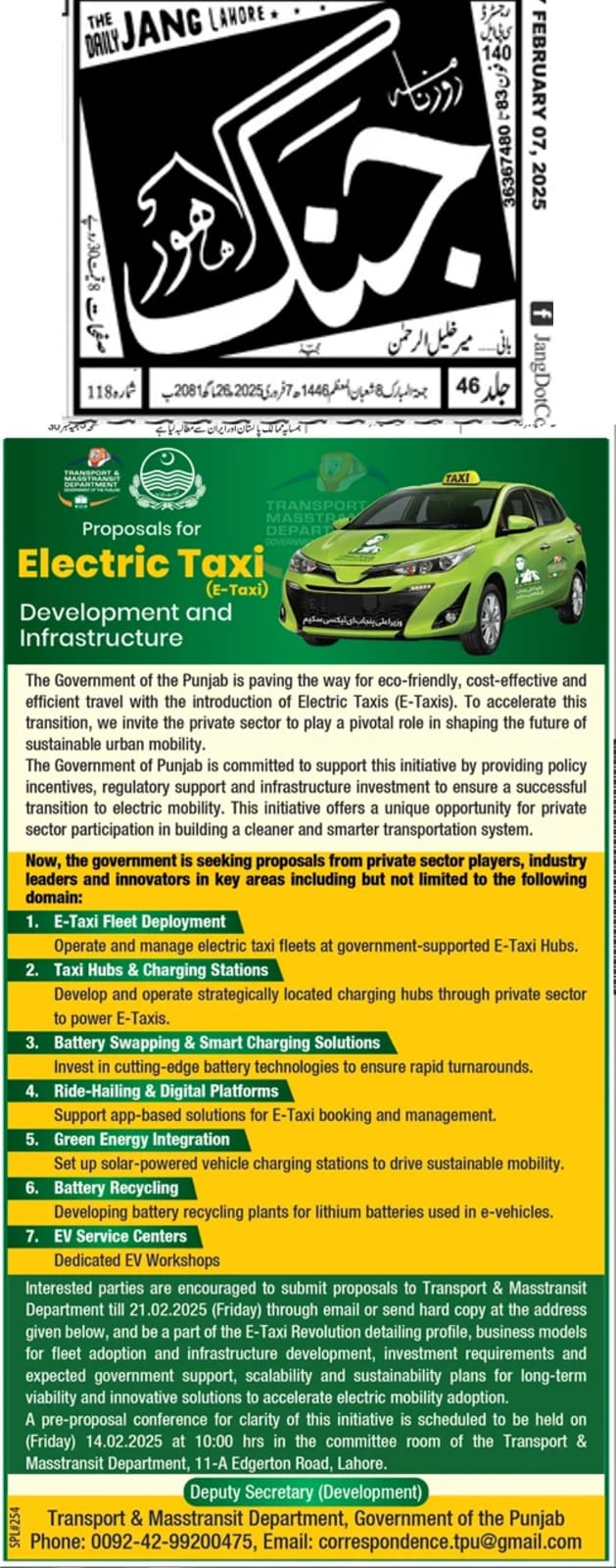 | الیکٹرک ٹیکسی ڈیولپمنٹ اور انفراسٹرکچر کے لیے ٹینڈر نوٹس |